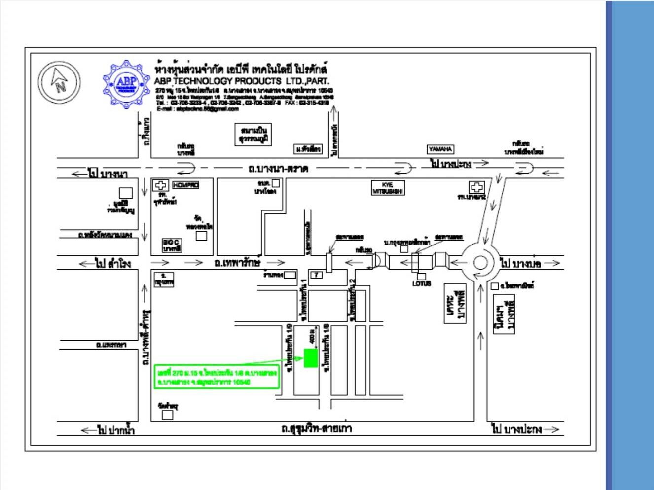 ABP TECHNOLOGY PRODUCTS LTD.,PART. ห้างหุ้นส่วนจำกัด เอบีพี เทคโนโลยี โปรดักส์ 270 หมู่15 ซ.ไทยประกัน 1/8 ต.บางเสาธง อ.บางเสาธง จ.สมุทรปราการ 10540 เวลาทำการ : วันจันทร์ – วันเสาร์โทร. 02-706-3387มือถือ.: 087-0014996,085-3313392E-mail:abptechno.56@gmail.com Line ID: 0870014996 เว็บไซต์ : WWW.ABP-TECHNOLOGY.COM ดาว์นโหลดแผนที่คลิกด้านล่าง ไฟล์สำหรับดาว์นโหลด (433 downloads ) ชื่อ-สกุล อีเมลล์ เบอร์โทรศัพท์ หัวเรื่อง รายละเอียดข้อความ